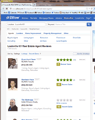 - Merchant Circle: 4208 results for “real estate agents in Louisville, KY” and not a single review. Sheesh! Half of the results aren’t even agents.