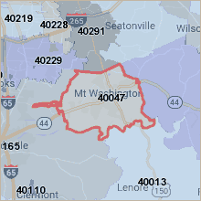 Centered on Mt. Washington, Kentucky, this zip code has a 6 mile radius. Almost all of 40047 is within Bullitt County but a small portion to the east crosses over into Spencer County.