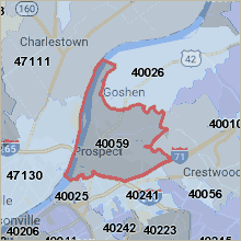 Covering land in both Jefferson County and Oldham County, 40059 is home to some of Louisville most expensive and luxurious properties. And the most Best Louisville Neighborhoods of any ZIP in Louisville, Kentucky! Its size is approximately 5 miles in radius. The City of Prospect is located within.