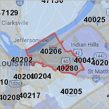 This Jefferson County ZIP code lies north of I64 and inside the Watterson Expressway. Approximately 3 miles in radius it also fully surrounds the quite small 40280 ZIP.