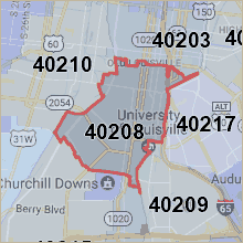 Centered around the University of Louisville, this ZIP code has about a 2 mile radius. Located within Jefferson County, it is almost entire west of I65, contains a good portion of Old Louisville south down to Churchill Downs.