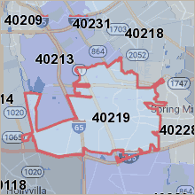 This oddly shaped ZIP code is about 4 miles in radius. It's located in central Jefferson County mostly to the east of I65 and insider the Gene Snyder Freeway.