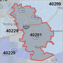 Five miles in radius, 40291 in located in the southeast portion of Jefferson County. Most of this would be considered Fern Creek to Louisvillians.