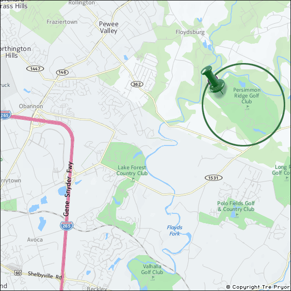Persimmon Ridge is a golf course community just across the Jefferson County line in Shelby County but not that far away from the Gene Snyder Expressway. The golf course was built in the late 1980's with play starting on June 16th, 1989. Next came the home building as the neighborhood grew. Like other Louisville golf course communities, GlenOaks, Glenmary, Hurstbourne, Lake Forest and Polo Fields, Persimmon Ridge boasts scenic views and more!